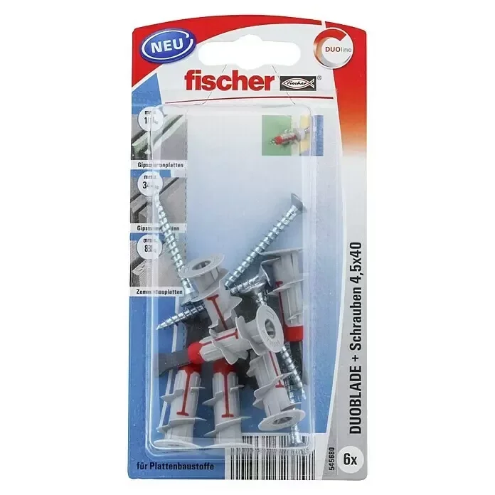 Der Gipskartondübel Duoblade K von fischer mit selbstbohrender Bohrspitze ermöglicht einen sauberen und effektiven Bohrvorgang. Der Dübel wird in der Vorsteckmontage mit einem Akku-Schrauber oder Schraubendreher oberflächenbündig in die Gipskartonplatten eingedreht. Der Gipskartondübel ist abgestimmt auf Holz-, Blech- und Spanplattenschrauben von 4 bis 5 mm Stärke sowie unterschiedlichen Haken und Ösen. Dadurch ist er universell geeignet, um z.B. Rauchmelder, Vorhangstangen und Jalousien sicher und schnell zu befestigen.