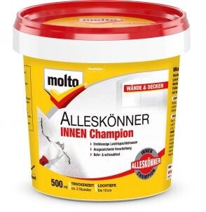 Molto Alleskönner INNEN Champion ist eine Premium-Leichtspachtelmasse und geeignet für den universellen Einsatz als Spot-Repair von Löchern und Rissen (2mm – 10cm Tiefe).