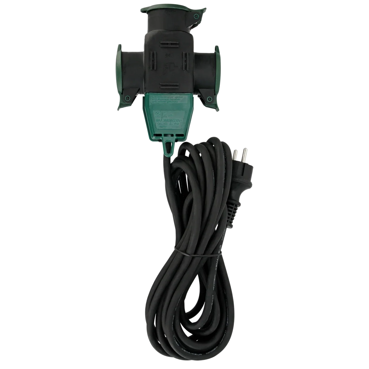 - KOMPLETT - 5 m lange, robuste Gummileitung H05RR-F mit spritzwassergeschütztem Gummi-Schutzkontakt-Stecker und 3-fach-Kupplung mit Deckel