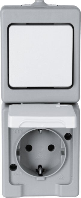 Senkrechte Aus-/Wechselschalter Kombination mit Steckdose für Aufputz-Installationen in Feuchträumen, Fa. Kopp